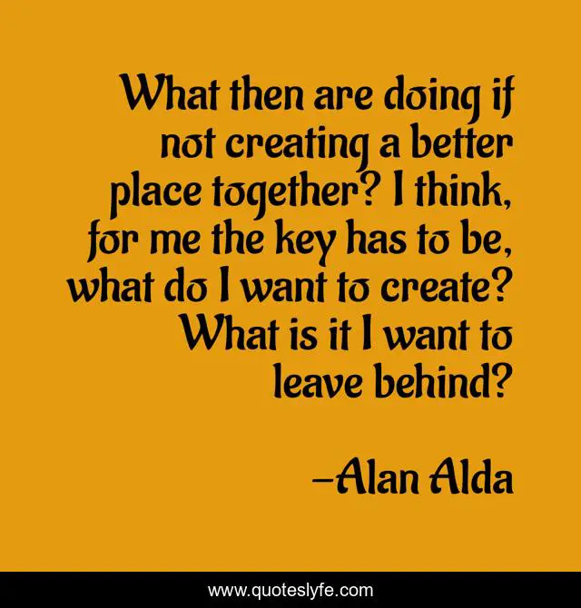 This page presents the quote "What then are doing if not creating a better place together? I think, for me the key has to be, what do I want to create? What is it I want to leave behind?". Author of this quote is Alan Alda. .
