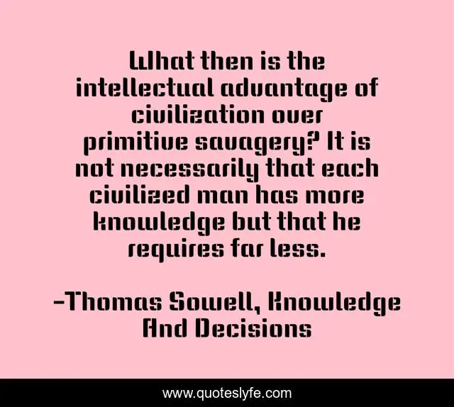 This page presents the quote "What then is the intellectual advantage of civilization over primitive savagery? It is not necessarily that each civilized man has more knowledge but that he requires far less.". Author of this quote is Thomas Sowell, Knowledge And Decisions. .