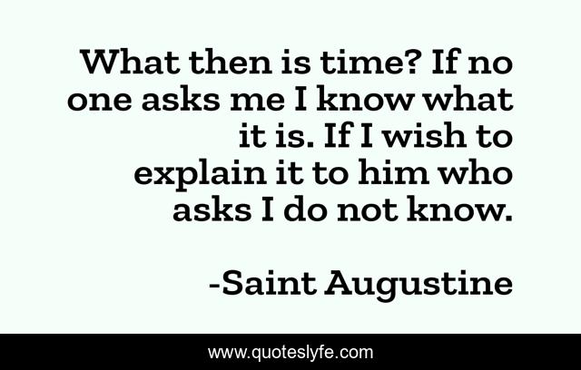 This page presents the quote "What then is time? If no one asks me I know what it is. If I wish to explain it to him who asks I do not know.". Author of this quote is Saint Augustine. This quote is about day, one,.