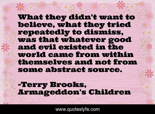 This page presents the quote "What they didn't want to believe, what they tried repeatedly to dismiss, was that whatever good and evil existed in the world came from within themselves and not from some abstract source.". Author of this quote is Terry Brooks, Armageddon's Children. This quote is about world, life, life-and-living, life-experience,.