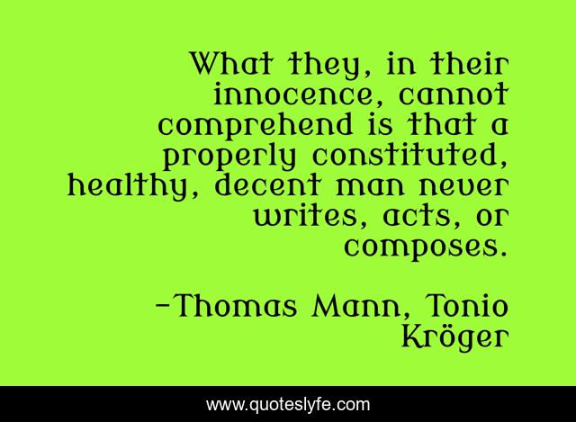 This page presents the quote "What they, in their innocence, cannot comprehend is that a properly constituted, healthy, decent man never writes, acts, or composes.". Author of this quote is Thomas Mann, Tonio Kröger. This quote is about art, artists, writing, decency, innocence, need,.