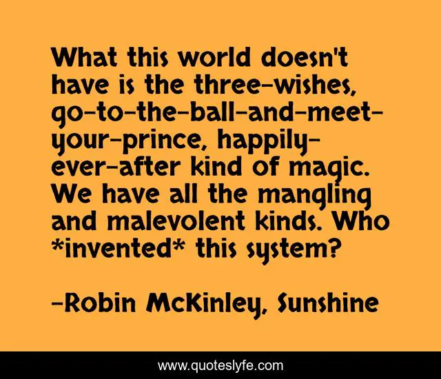 This page presents the quote "What this world doesn't have is the three-wishes, go-to-the-ball-and-meet-your-prince, happily-ever-after kind of magic. We have all the mangling and malevolent kinds. Who *invented* this system?". Author of this quote is Robin McKinley, Sunshine. This quote is about wishes, magic,.