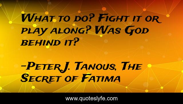 This page presents the quote "What to do? Fight it or play along? Was God behind it?". Author of this quote is Peter J. Tanous, The Secret of Fatima. This quote is about mystery, novel, christian, mystery-thriller, thriller,.