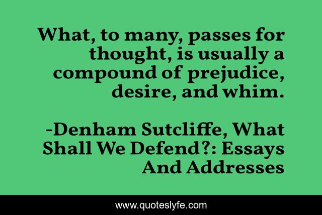 This page presents the quote "What, to many, passes for thought, is usually a compound of prejudice, desire, and whim.". Author of this quote is Denham Sutcliffe, What Shall We Defend?: Essays And Addresses. This quote is about thought, prejudice,.