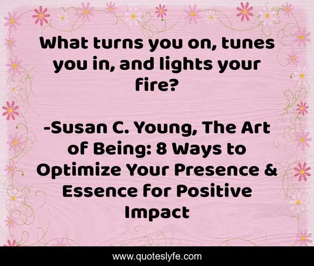 "Susan C. Young, The Art of Being: 8 Ways to Optimize Your Presence & Essence for Positive Impact Quotes." Quoteslyfe.com, 2025. Sat. 06 Dec. 2025. <https://www.quoteslyfe.com/quote/What-turns-you-on-tunes-you-in-92375>.