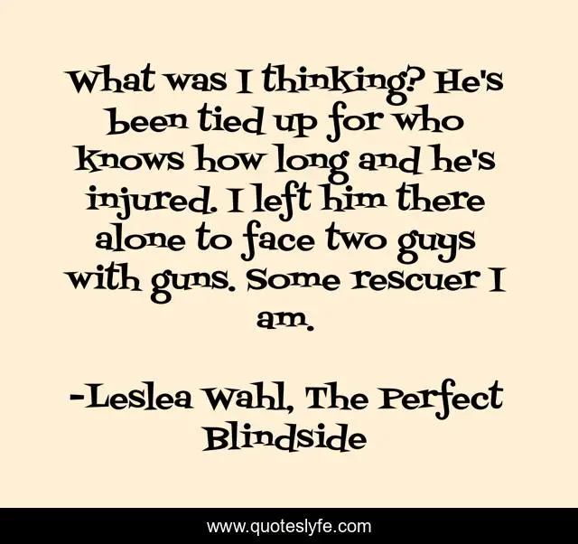This page presents the quote "What was I thinking? He's been tied up for who knows how long and he's injured. I left him there alone to face two guys with guns. Some rescuer I am.". Author of this quote is Leslea Wahl, The Perfect Blindside. This quote is about alone, thinking, injury, rescuer,.