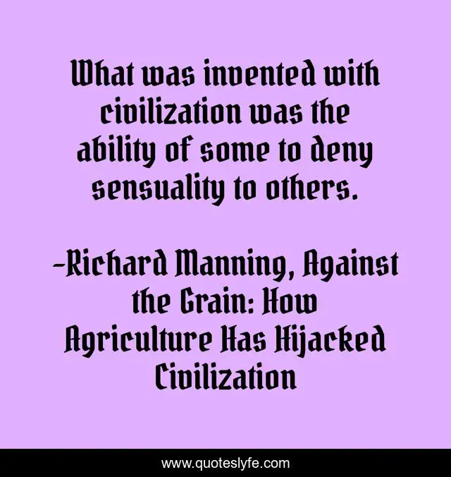 This page presents the quote "What was invented with civilization was the ability of some to deny sensuality to others.". Author of this quote is Richard Manning, Against the Grain: How Agriculture Has Hijacked Civilization. This quote is about civilization, sensuality,.