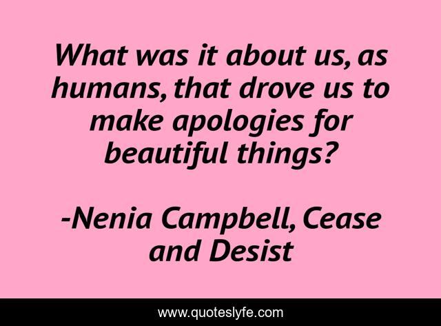 This page presents the quote "What was it about us, as humans, that drove us to make apologies for beautiful things?". Author of this quote is Nenia Campbell, Cease and Desist. This quote is about beautiful, beauty, beautiful-things, philosophy, cruelty, new-adult, superficiality, ethics, corruption,.