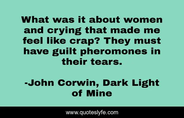This page presents the quote "What was it about women and crying that made me feel like crap? They must have guilt pheromones in their tears.". Author of this quote is John Corwin, Dark Light of Mine. This quote is about guilt, crying, women,.