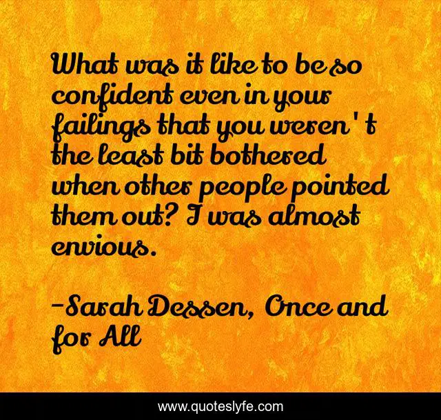 This page presents the quote "What was it like to be so confident even in your failings that you weren't the least bit bothered when other people pointed them out? I was almost envious.". Author of this quote is Sarah Dessen, Once and for All. This quote is about confidence, self-awareness, envious, failings,.