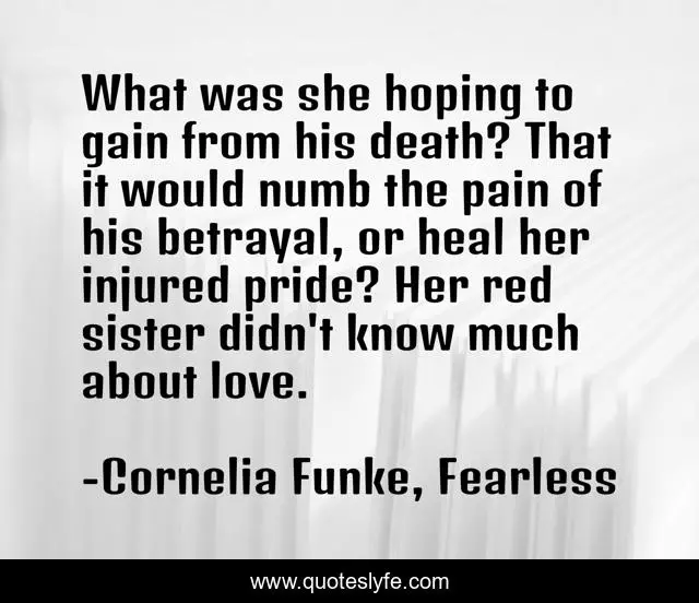 This page presents the quote "What was she hoping to gain from his death? That it would numb the pain of his betrayal, or heal her injured pride? Her red sister didn't know much about love.". Author of this quote is Cornelia Funke, Fearless. This quote is about betrayal, love, revenge, affection,.