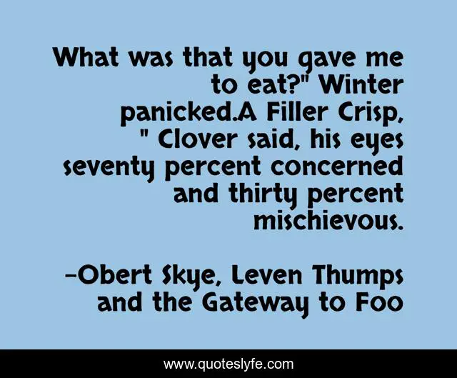 This page presents the quote "What was that you gave me to eat?" Winter panicked.A Filler Crisp, " Clover said, his eyes seventy percent concerned and thirty percent mischievous.". Author of this quote is Obert Skye, Leven Thumps and the Gateway to Foo. This quote is about geth, clover, winter, funny, food, hungry, comedy,.