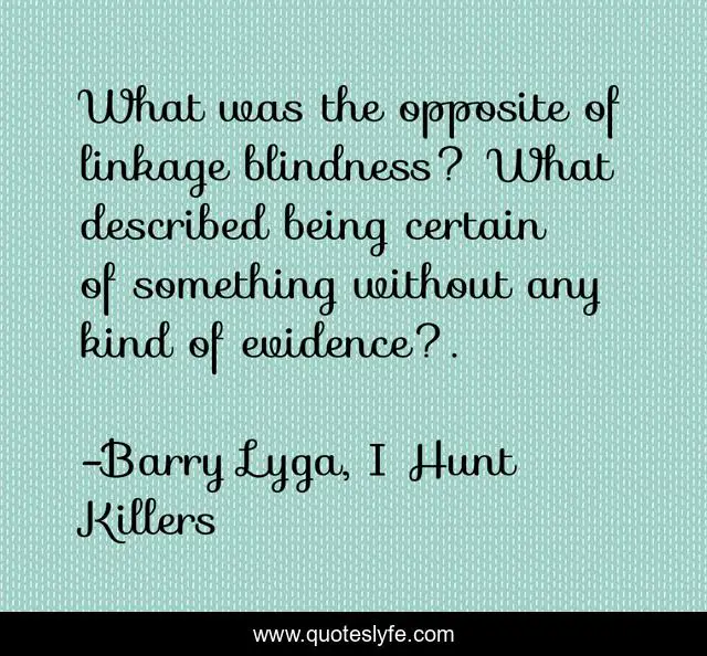 This page presents the quote "What was the opposite of linkage blindness? What described being certain of something without any kind of evidence?.". Author of this quote is Barry Lyga, I Hunt Killers. .
