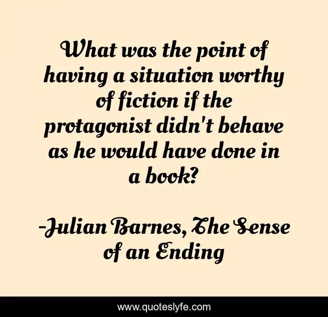 This page presents the quote "What was the point of having a situation worthy of fiction if the protagonist didn't behave as he would have done in a book?". Author of this quote is Julian Barnes, The Sense of an Ending. This quote is about fiction, life, protagonist, reality,.