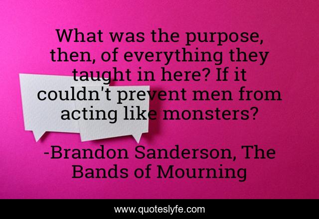 This page presents the quote "What was the purpose, then, of everything they taught in here? If it couldn't prevent men from acting like monsters?". Author of this quote is Brandon Sanderson, The Bands of Mourning. This quote is about human-nature, religion, purpose, teachings,.