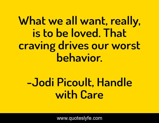 This page presents the quote "What we all want, really, is to be loved. That craving drives our worst behavior.". Author of this quote is Jodi Picoult, Handle with Care. This quote is about wants, love, craving, affection, desires,.