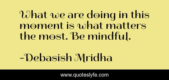 This page presents the quote "What we are doing in this moment is what matters the most. Be mindful.". Author of this quote is Debasish Mridha. This quote is about philosophy, debasish-mridha, quotes, debasish-mridha-md, inspirational, be-mindful, enthusiasm, what-matters-the-most, live-in-the-moment,.