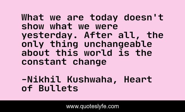 This page presents the quote "What we are today doesn't show what we were yesterday. After all, the only thing unchangeable about this world is the constant change". Author of this quote is Nikhil Kushwaha, Heart of Bullets. .
