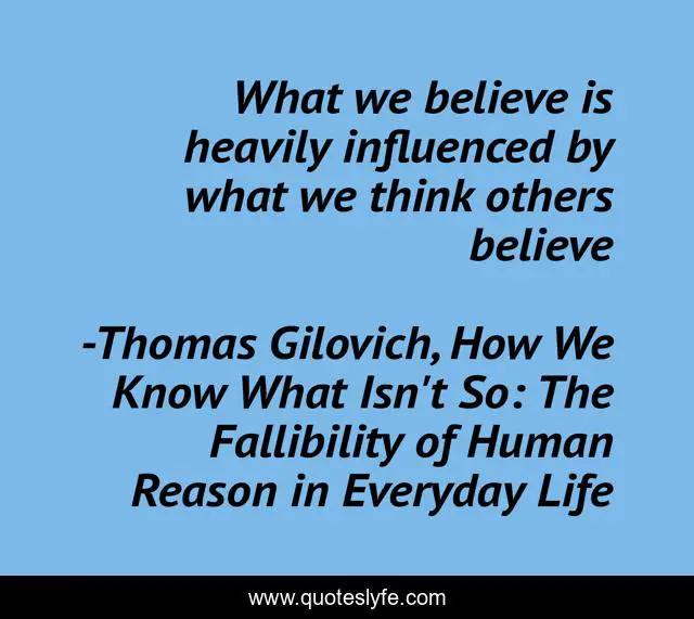 This page presents the quote "What we believe is heavily influenced by what we think others believe". Author of this quote is Thomas Gilovich, How We Know What Isn't So: The Fallibility of Human Reason in Everyday Life. This quote is about human-behavior, mind, psychology, logic,.
