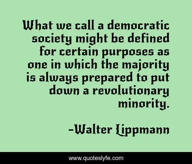 This page presents the quote "What we call a democratic society might be defined for certain purposes as one in which the majority is always prepared to put down a revolutionary minority.". Author of this quote is Walter Lippmann. This quote is about down, always, minority,.