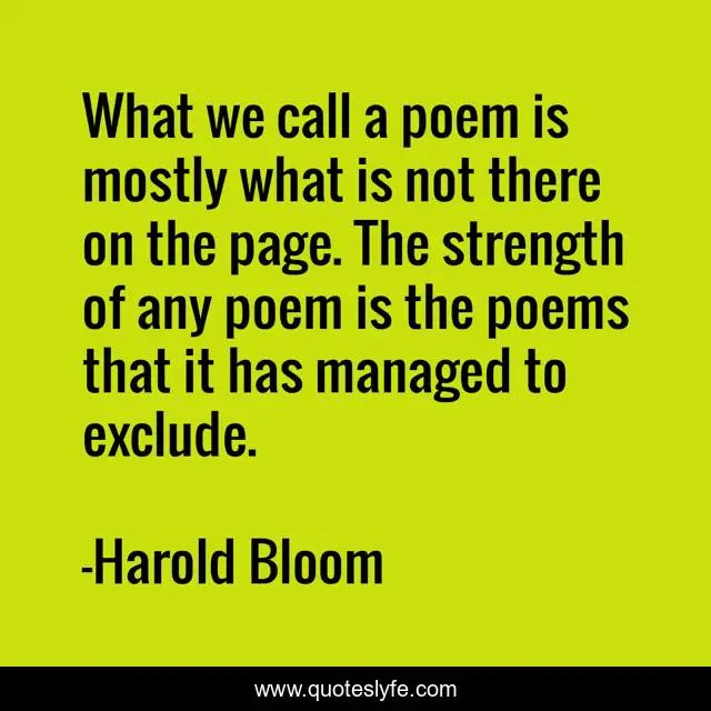 This page presents the quote "What we call a poem is mostly what is not there on the page. The strength of any poem is the poems that it has managed to exclude.". Author of this quote is Harold Bloom. This quote is about poem, call, page,.