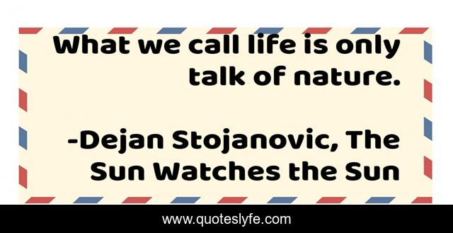 This page presents the quote "What we call life is only talk of nature.". Author of this quote is Dejan Stojanovic, The Sun Watches the Sun. This quote is about life, literature, nature, dejan-stojanovic, philosophy, poetry, wisdom, talking, books,.