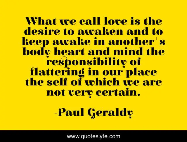 This page presents the quote "What we call love is the desire to awaken and to keep awake in another's body heart and mind the responsibility of flattering in our place the self of which we are not very certain.". Author of this quote is Paul Geraldy. This quote is about love, affection,.