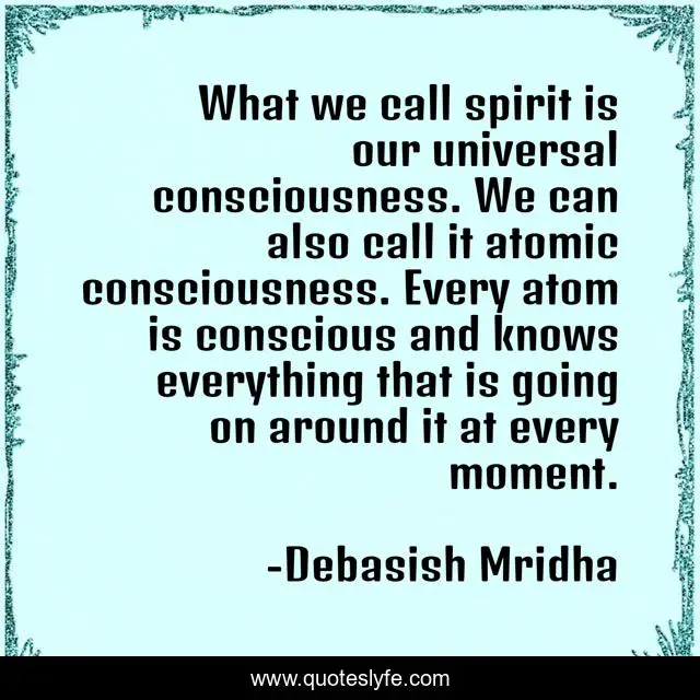 This page presents the quote "What we call spirit is our universal consciousness. We can also call it atomic consciousness. Every atom is conscious and knows everything that is going on around it at every moment.". Author of this quote is Debasish Mridha. This quote is about universal-consciousness, quotes, philosophy, debasish-mridha, atoms, what-is-a-spirit, atomic-consciousness, inspirational, enthusiasm,.