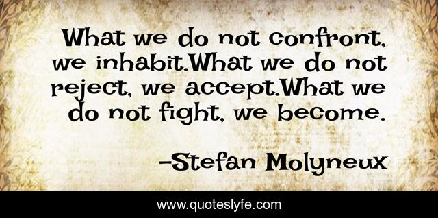This page presents the quote "What we do not confront, we inhabit.What we do not reject, we accept.What we do not fight, we become.". Author of this quote is Stefan Molyneux. This quote is about psychology, philosophy, awareness, consciousness, self-knowledge,.