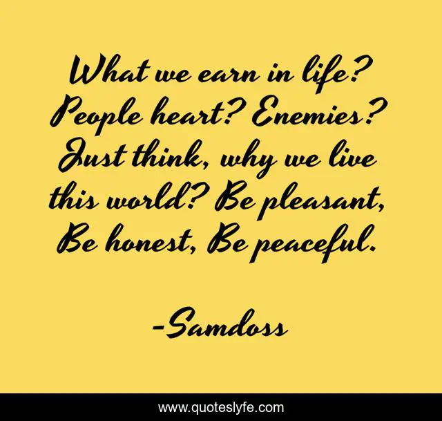 This page presents the quote "What we earn in life? People heart? Enemies? Just think, why we live this world? Be pleasant, Be honest, Be peaceful.". Author of this quote is Samdoss. This quote is about life, people,.