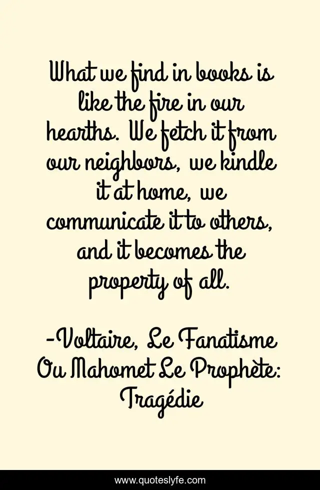 This page presents the quote "What we find in books is like the fire in our hearths. We fetch it from our neighbors, we kindle it at home, we communicate it to others, and it becomes the property of all.". Author of this quote is Voltaire, Le Fanatisme Ou Mahomet Le Prophète: Tragédie. .