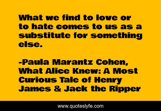 This page presents the quote "What we find to love or to hate comes to us as a substitute for something else.". Author of this quote is Paula Marantz Cohen, What Alice Knew: A Most Curious Tale of Henry James & Jack the Ripper. This quote is about relationships, inspirational-love, love, advice-for-women, advice, relationship-advice, reality, volatile, substitute,.