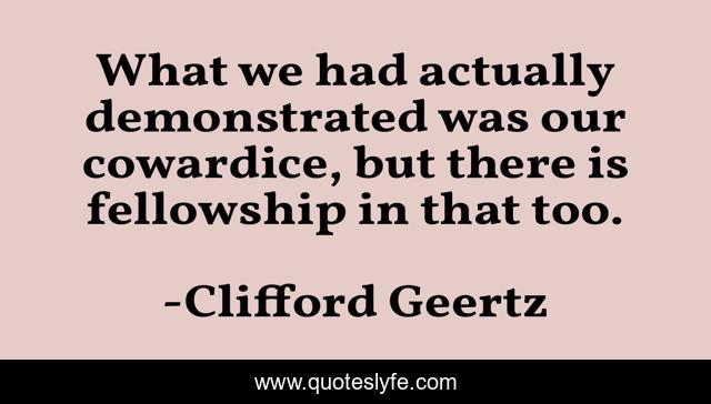This page presents the quote "What we had actually demonstrated was our cowardice, but there is fellowship in that too.". Author of this quote is Clifford Geertz. This quote is about commiseration, candor, friendship, sincerity, weakness,.