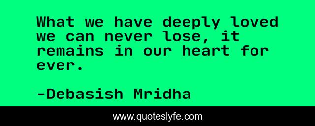 This page presents the quote "What we have deeply loved we can never lose, it remains in our heart for ever.". Author of this quote is Debasish Mridha. This quote is about life, love, knowledge, inspirational, intelligence, philosophy, wisdom, quotes, affection,.