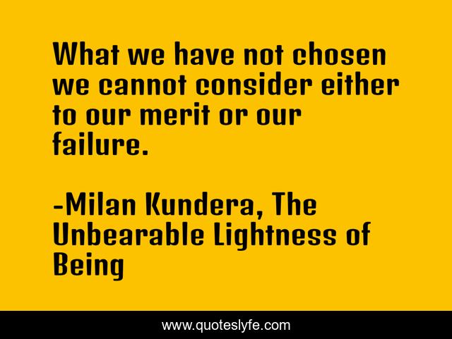 This page presents the quote "What we have not chosen we cannot consider either to our merit or our failure.". Author of this quote is Milan Kundera, The Unbearable Lightness of Being. This quote is about failure, merit,.