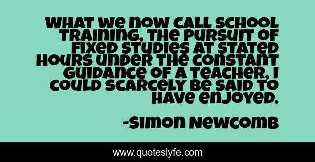 This page presents the quote "What we now call school training, the pursuit of fixed studies at stated hours under the constant guidance of a teacher, I could scarcely be said to have enjoyed.". Author of this quote is Simon Newcomb. This quote is about school, said, training,.