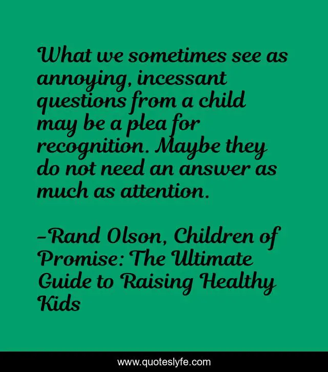This page presents the quote "What we sometimes see as annoying, incessant questions from a child may be a plea for recognition. Maybe they do not need an answer as much as attention.". Author of this quote is Rand Olson, Children of Promise: The Ultimate Guide to Raising Healthy Kids. This quote is about parenting, health, healing,.