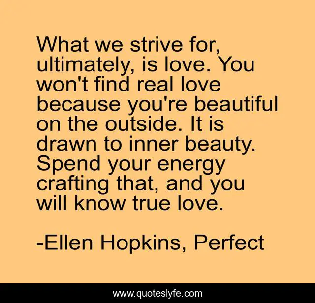This page presents the quote "What we strive for, ultimately, is love. You won't find real love because you're beautiful on the outside. It is drawn to inner beauty. Spend your energy crafting that, and you will know true love.". Author of this quote is Ellen Hopkins, Perfect. This quote is about love, beauty, affection, yourself,.