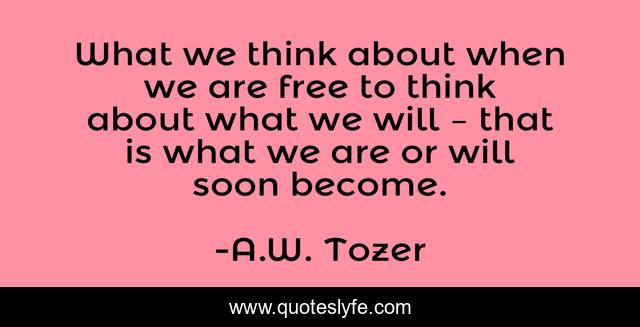 This page presents the quote "What we think about when we are free to think about what we will – that is what we are or will soon become.". Author of this quote is A.W. Tozer. This quote is about freedom, thoughts,.