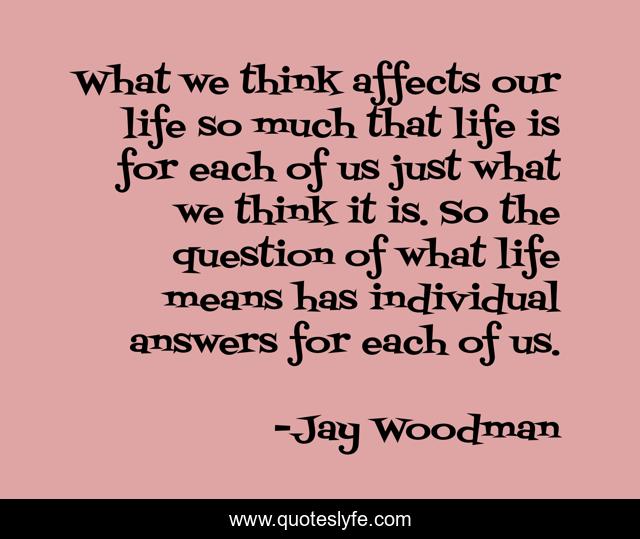 This page presents the quote "What we think affects our life so much that life is for each of us just what we think it is. So the question of what life means has individual answers for each of us.". Author of this quote is Jay Woodman. This quote is about life-questions, life, thinking, life-and-sayings, life-philosophy, meaning-of-life, think,.