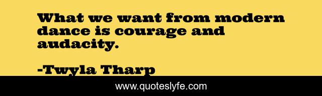 This page presents the quote "What we want from modern dance is courage and audacity.". Author of this quote is Twyla Tharp. This quote is about dance, modern,.