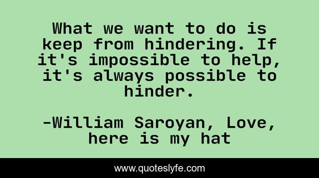 This page presents the quote "What we want to do is keep from hindering. If it's impossible to help, it's always possible to hinder.". Author of this quote is William Saroyan, Love, here is my hat. .