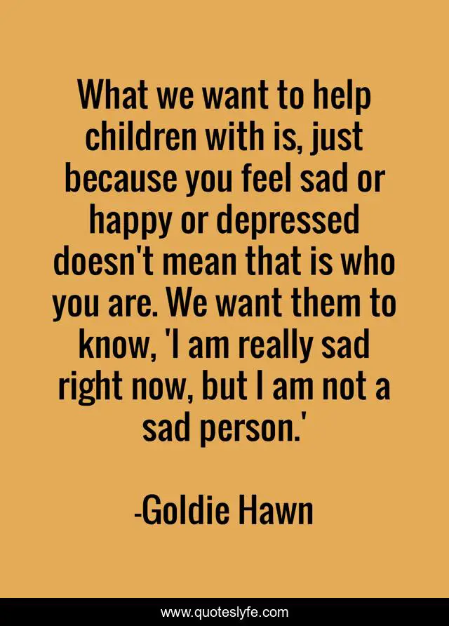 This page presents the quote "What we want to help children with is, just because you feel sad or happy or depressed doesn't mean that is who you are. We want them to know, 'I am really sad right now, but I am not a sad person.'". Author of this quote is Goldie Hawn. This quote is about children, happy,.