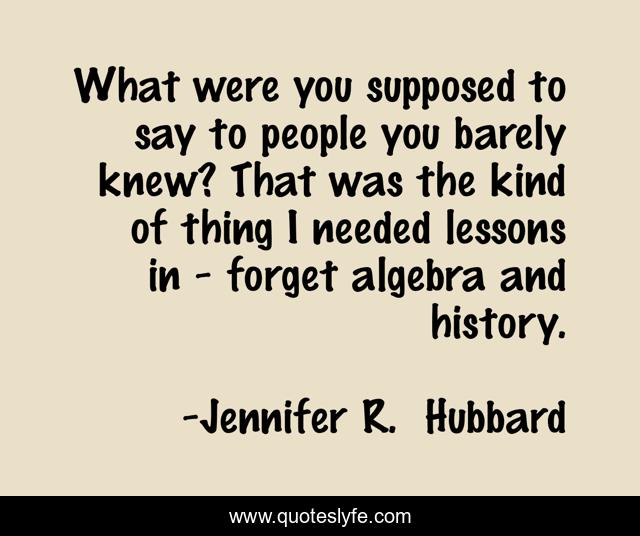 This page presents the quote "What were you supposed to say to people you barely knew? That was the kind of thing I needed lessons in - forget algebra and history.". Author of this quote is Jennifer R. Hubbard. This quote is about real, witty, sense,.