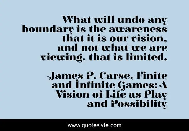 This page presents the quote "What will undo any boundary is the awareness that it is our vision, and not what we are viewing, that is limited.". Author of this quote is James P. Carse, Finite and Infinite Games: A Vision of Life as Play and Possibility. This quote is about life-lesson, enthusiasm, revelatory, inspirational,.