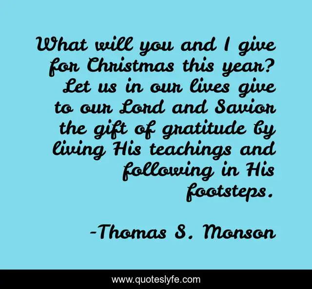 This page presents the quote "What will you and I give for Christmas this year? Let us in our lives give to our Lord and Savior the gift of gratitude by living His teachings and following in His footsteps.". Author of this quote is Thomas S. Monson. This quote is about gratitude, living, gift,.
