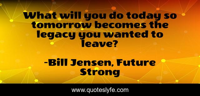 This page presents the quote "What will you do today so tomorrow becomes the legacy you wanted to leave?". Author of this quote is Bill Jensen, Future Strong. This quote is about enthusiasm, future, leadership, inspirational, self-help,.
