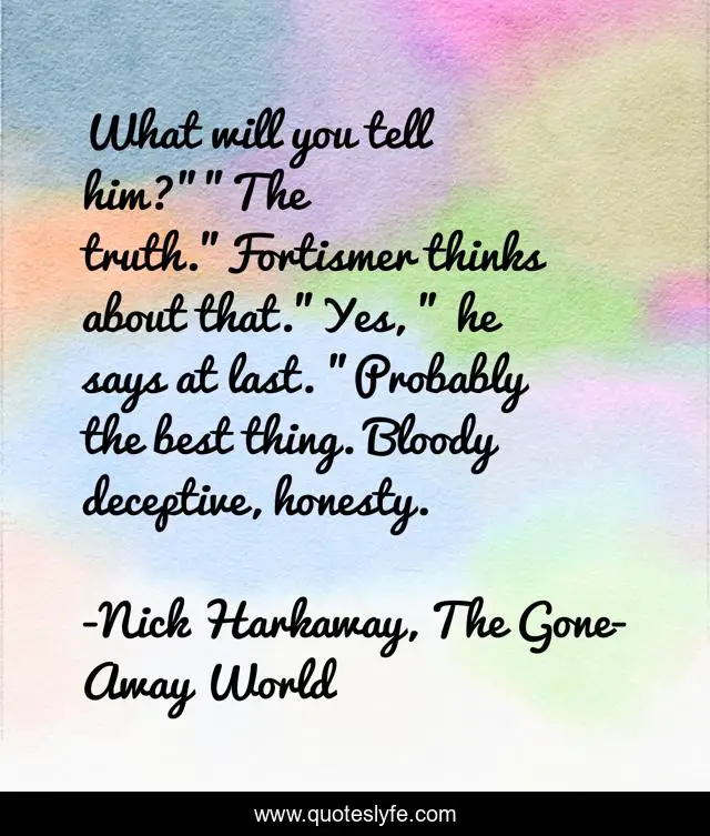 This page presents the quote "What will you tell him?""The truth."Fortismer thinks about that."Yes, " he says at last. "Probably the best thing. Bloody deceptive, honesty.". Author of this quote is Nick Harkaway, The Gone-Away World. This quote is about honesty, truth,.