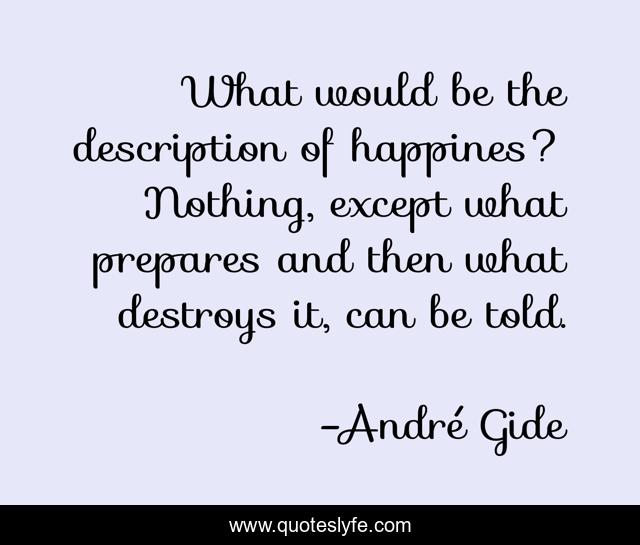 This page presents the quote "What would be the description of happines? Nothing, except what prepares and then what destroys it, can be told.". Author of this quote is André Gide. This quote is about quotes, literature, andre-gide, happiness,.