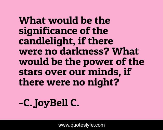 This page presents the quote "What would be the significance of the candlelight, if there were no darkness? What would be the power of the stars over our minds, if there were no night?". Author of this quote is C. JoyBell C.. This quote is about darkness-and-light, candles, wisdom, stars, light, light-and-darkness,.